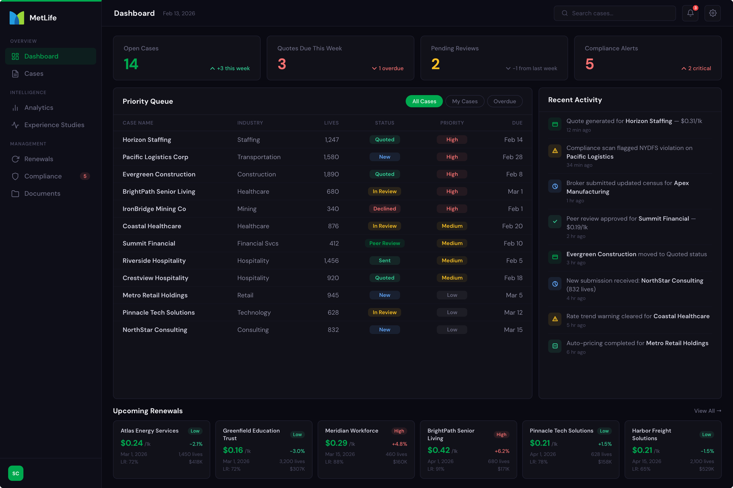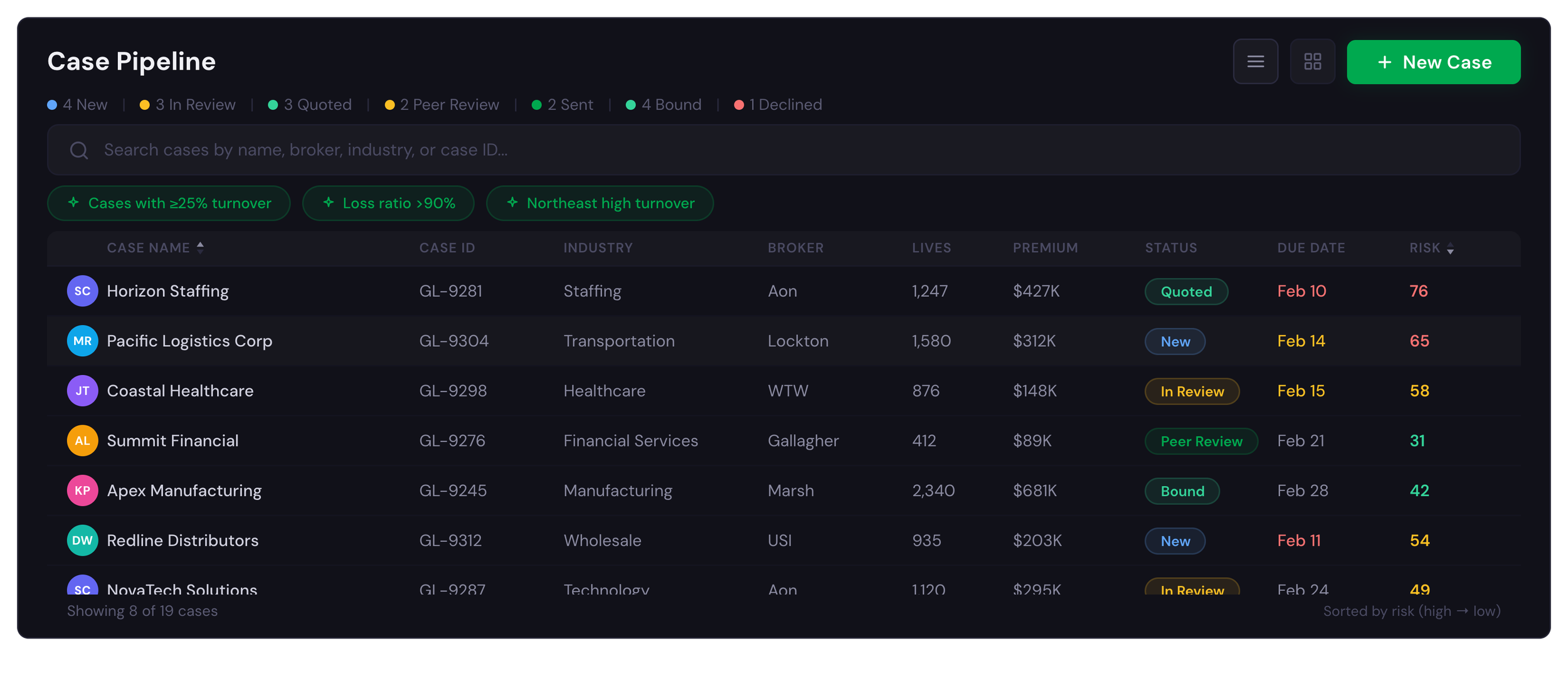 Early designs showed cases in chronological order. Testing revealed actuaries constantly scanned for red flags—high turnover, compliance violations, tight deadlines. I rebuilt the pipeline to surface urgent cases first, with risk scores visible at a glance.