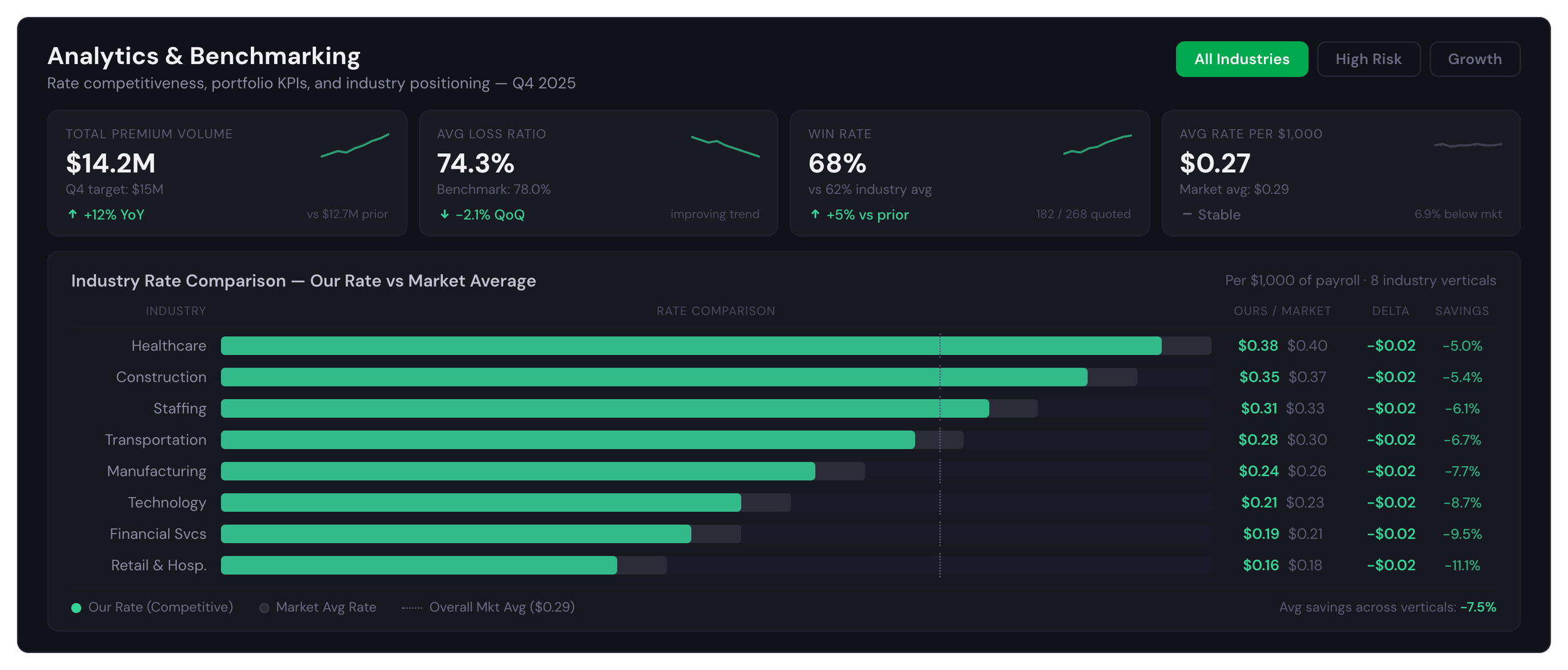 Actuaries priced in a vacuum, unsure if their rates were too high or leaving money on the table. I designed portfolio analytics that benchmark against industry averages by vertical, showing exactly where they're competitive and where they're losing deals.