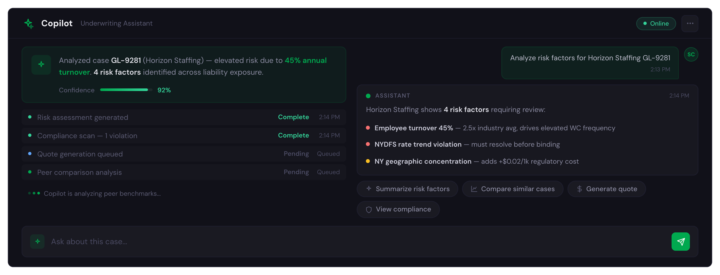 When pricing a staffing case with 45% turnover, the actuary said: "I know we've done this before, but I can't remember where." I designed Copilot to surface similar cases instantly—no folder diving, no asking around. Precedent became a starting point, not a research project.